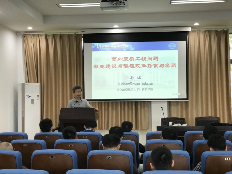 在解读课程教学设计、达成度分析与复杂工程问题中,孙院长指出,应根据毕业要求设计课程体系,课程的设置必须通过知识传授、以知识为载体的能力、素养培养对毕业要求指标点给予支撑。他以“数据结构”、“数据结构实验”、“数据结构课程设计”三门不同类型(理论、实验、设计)课程进行说明,从教学大纲、教学环节、考核方法上设计教学目标,贯彻落实毕业要求的指标点,逐层提高学生的知识、能力、素养,解决复杂工程问题。教师上课不仅仅只用教材,还要让学生查阅大量的文献,让学生有国际化的视野;通过过程性考核让学生知道自己哪里做得好,哪里是弱项,主动地进行补充与提高。