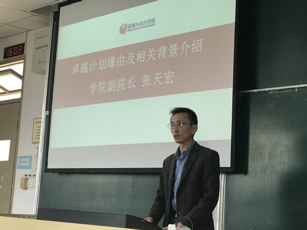 典礼伊始,张天宏对入选卓越工程师班的学生表示祝贺,并指出学院对于“卓越计划”培养工作的重视及近年来“卓越计划”培养所取得的成绩,希望学院通过“卓越计划”为国家输送更多优秀工程技术人才,助力国家人才强国战略。其次,他简要介绍了习近平新时代中国特色社会主义思想教育理论体系的“9个坚持”,结合“坚持深化教育改革创新”、“坚持把服务中华民族伟大复兴作为教育的重要使命”两项坚持,并结合教育部“六卓越一拔尖”计划2.0,指出:“卓越计划”就是要通过改革创新,培养具有创新意识、实践能力、进取精神的,能够服务中华民族伟大复兴的社会主义建设者和接班人。最后,张天宏对所有在场的学生提出了殷切希望,希望同学们能利用好学校及学院提供的各项资源,通过师生的共同努力,砥砺前行,达成卓越工程师的培养目标。
