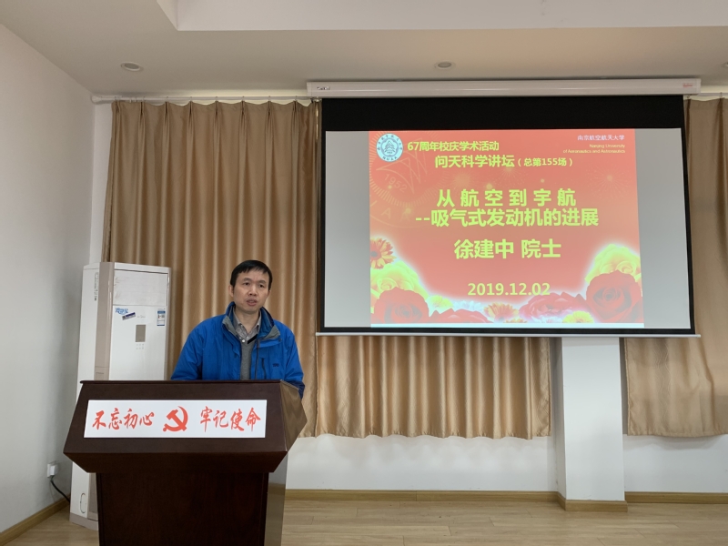 2019年12月2日,中国科学院院士、我校兼职教授徐建中应邀做客我校问天科学讲坛(总第155期),在我院十号楼619报告厅作了题为“从航空到宇航——吸气式发动机的进展”的学术报告,中国科学院院士宣益民、校科协副秘书长刘双丽、学院副院长谭慧俊等100余名师生参加了报告会。报告会由学院副院长谭慧俊主持。