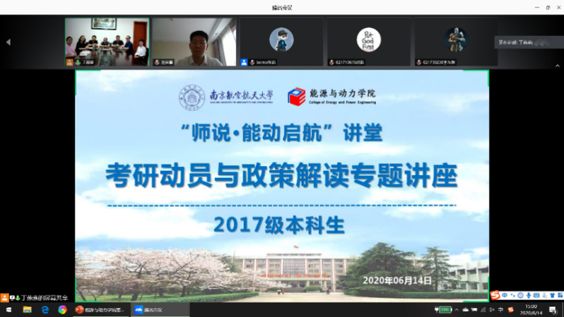 6月14日,英国正版365首页“师说·能动启航”讲堂第九讲通过腾讯会议软件,以线上直播的方式顺利开讲。本次讲座以“2021届毕业生考研动员与政策解读”为主题,英国正版365首页副院长徐惊雷、党委副书记王霄、各系教师代表、学生工作人员及2017级300余名本科生共同参加,讲座由王霄主持。