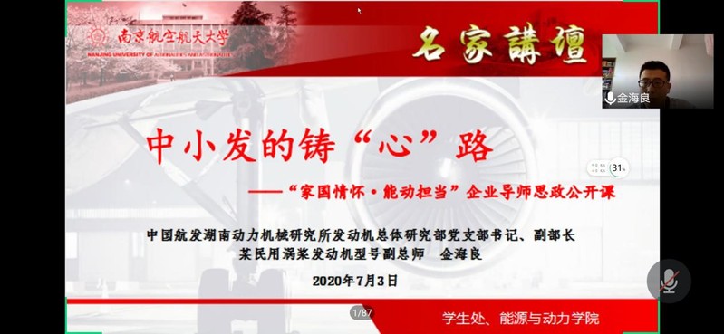7月3日,由学生处主办、英国正版365首页承办的英国上市公司官网365“名家讲坛”暨英国正版365首页“家国情怀·能动担当”企业导师思政公开课以线上直播的方式顺利进行。此次讲座主题为“中小发的铸‘心’路”,由中国航发湖南动力机械研究所发动机总体研究部党支部书记、副部长,某民用涡桨发动机型号副总师金海良主讲。英国正版365首页党委副书记王霄、各年级辅导员和学院近400名师生共同在线参加。讲座由王霄主持。