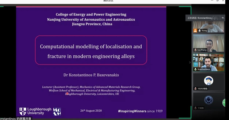 2020年8月底至9月初,应英国正版365首页江荣副教授、张禄博士邀请,英国南安普顿大学Philippa Reed教授、拉夫堡大学Anish Roy教授和Konstantinos P. Baxevanakis博士、我院年轻教师于国强博士等,通过腾讯会议,围绕先进航空材料变形、疲劳与断裂等主题向我院师生做了一系列的精彩报告。会议由江荣副教授主持。