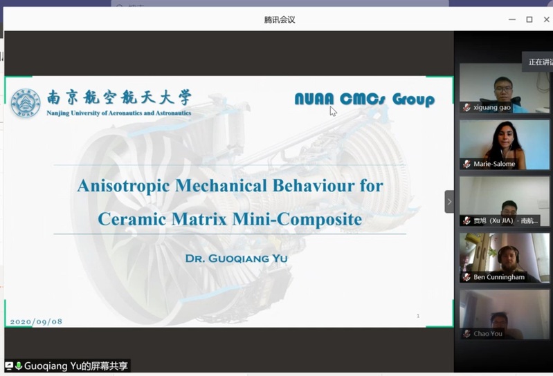 随后,我院的青年教师于国强做了陶瓷基小复合材料各向异性的力学行为的报告,与南安普顿大学Philippa Reed做了深入交流,我院教授高希光、副研究员尤超、博士贾旭也参与了交流。双方就后续的合作研究内容及方式进行了讨论。