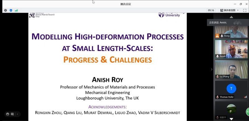 8月28日下午16:00-17:00,拉夫堡大学教授Anish Roy做了题为《Modelling high-deformation processes at small length-scales progress and challenges》的线上报告。来自英国拉夫堡大学机械电气与制造工程学院教授Anish Roy主要从事材料力学行为的理论计算、试验研究以及微观结构-性能-行为的演化关系的研究。在报告中,Anish Roy重点讨论了基于小尺度的大变形过程尤其是加工过程中的数值模拟方法,展示了他们在小尺度下模拟机加工过程中材料的变形和金属材料再结晶方面的工作进展。
