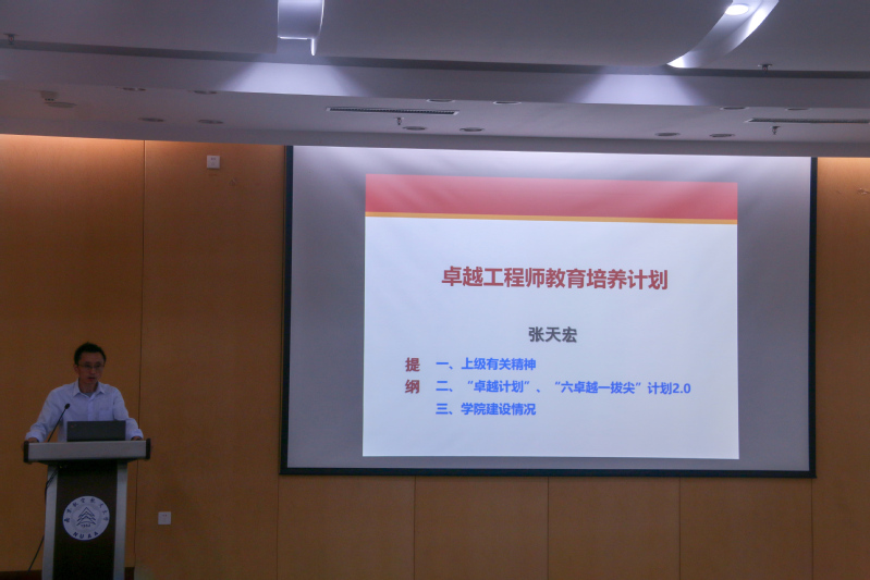 典礼伊始,张天宏对入选卓越工程师班的学生表示祝贺,并指出学院对于“卓越计划”培养工作的关注、重视及近年来“卓越计划”培养所取得的成绩,希望学院通过“卓越计划”为国家输送更多优秀学生,助力国家人才强国战略。其次,他简要介绍了习近平新时代中国特色社会主义思想主题教育理论体系,结合“坚持深化教育改革创新”、“坚持把服务中华民族伟大复兴作为教育的重要使命”两项坚持,结合教育部“六卓越一拔尖”计划2.0,指出:“卓越计划”就是要通过改革创新,培养具有创新意识、实践能力、进取精神的,能够服务中华民族伟大复兴的社会主义建设者和接班人。最后,张天宏对所有在场的学生提出了殷切希望,希望同学们通过卓越班的学习和生活,能够成就自己高尚的道德情操、坚实的理论基础、创新的科学思维、踏实的实干精神,成为合格的卓越工程师!