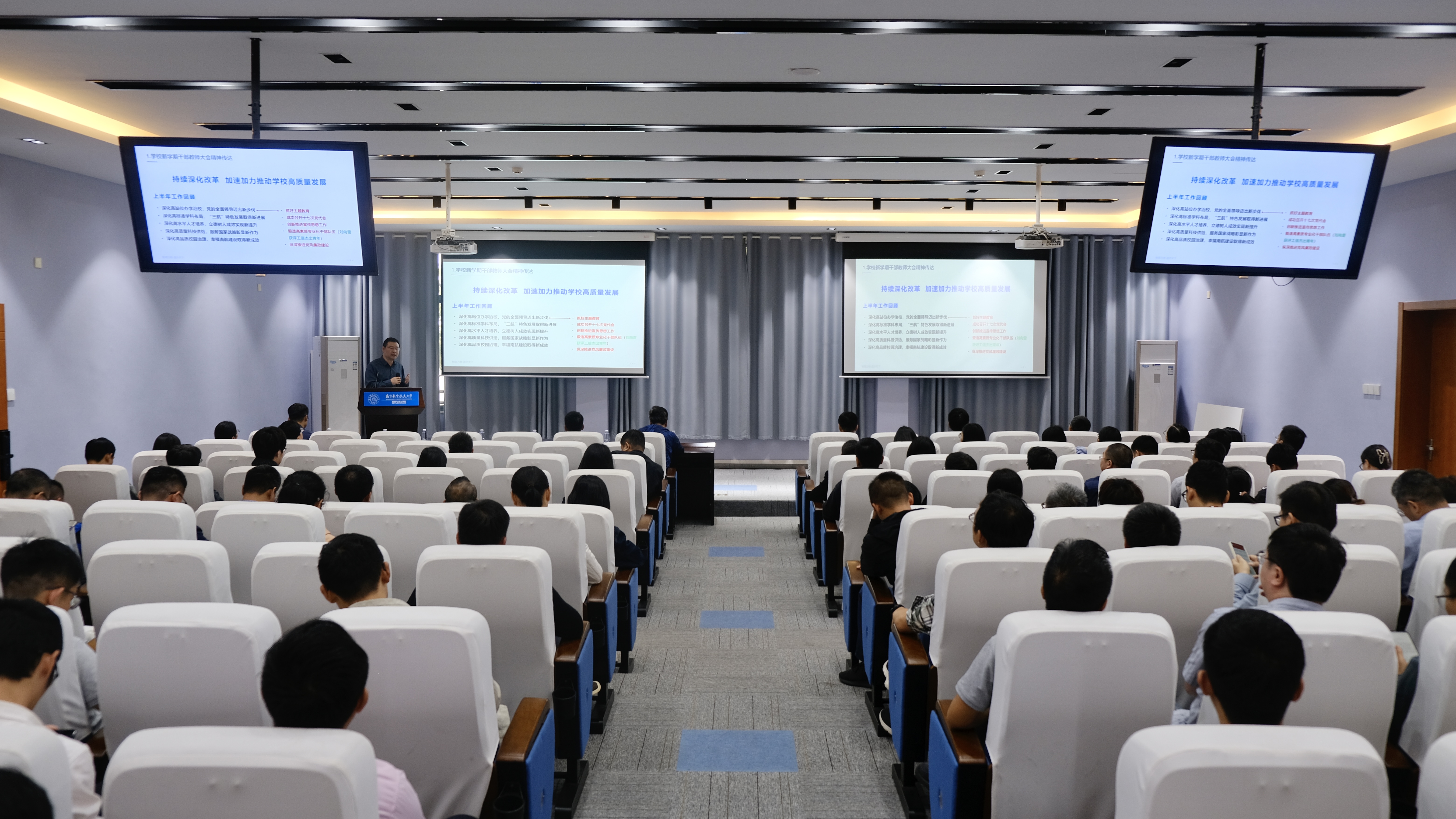 会上,院长毛军逵传达学校干部教师大会精神,代表学院领导班子作上半年工作汇报,部署下半年重点工作。毛军逵围绕郑书记和单校长大会报告内容,带领全体教师全面回顾学校上半年工作,明确下半年工作任务。他强调要深刻学习领会报告精神内涵,注重高质量发展、系统性发展、国际化发展,结合学院实际推进各项工作。毛军逵从党建工作、学生工作、学科平台、师资队伍、人才培养、科学研究、实验中心和国际合作等方面,汇报工作进展和成果。他强调学院要聚焦“后两机专项时代新发展”,做好新一轮专项推进工作;进一步做好学院发展和运行的体系化改革,围绕发力点优化配置资源;常抓不懈做好安全保密、师德师风等和师生密切相关的工作,针对下半年重点工作做好统筹谋划,系统推进,学院全体教职工要凝心聚力,共谋发展。