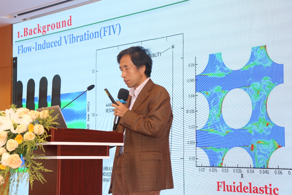 西安交通大学周进雄教授为参会者带来了题为《Flow-induced Vibration in Steam Generators and Heat Exchangers: Models and Recent Developments》的精彩演讲,深入探讨了在开发时域模型及其数值实现方面的工作,涵盖了流体弹性模型、管束的非线性动力学以及磨损模拟等内容,并突出讲解了一些可能的研究方向。