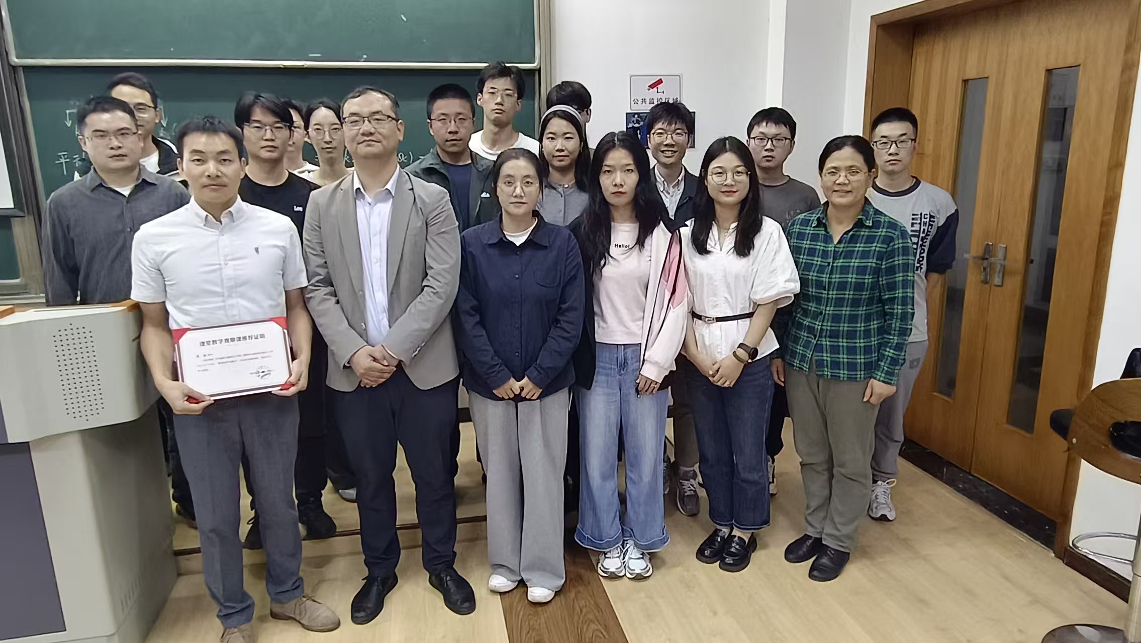 开放课堂结束,学院副院长张悦教授为周标颁发课堂教学观摩课推荐证明证书,参加观摩教师和周标老师合影留念。