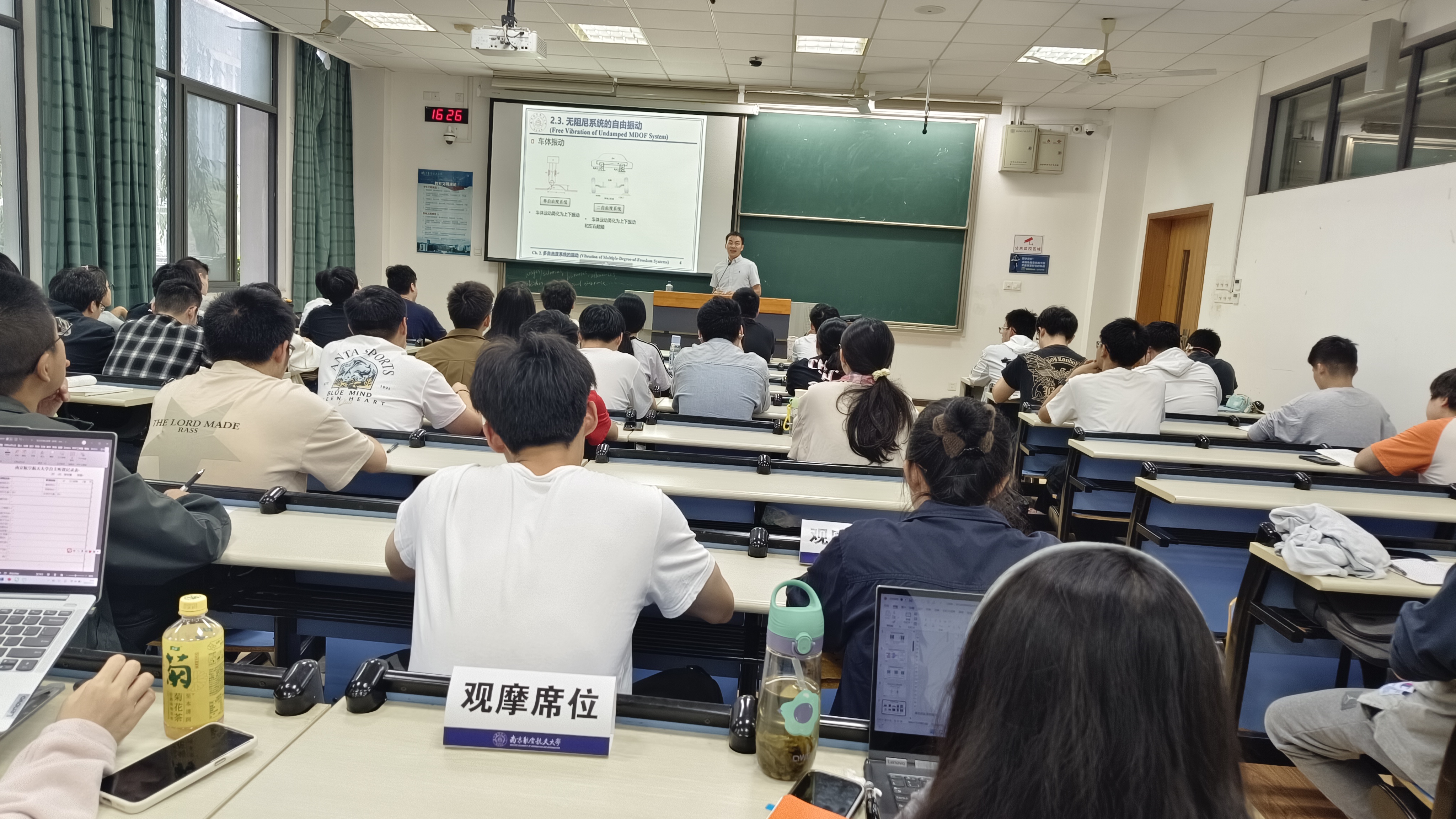 开放课堂过程中,周标主讲无阻尼系统的自由振动-二自由度系统内容,针对无阻尼二自由度振动系统模态特性分析数学公式推导复杂的难题,他在课堂教学过程中注重物理直觉、数学美感与可视化动态图示的深度融合,引导学生从单自由度振动系统的直观思维顺利过渡到二自由度振动系统的抽象思维,并深刻理解模态(振型) 这一核心概念的物理与数学内涵。课程目标要求明确,讲解知识点清晰,课件中用了大量动图,形象生动,便于概念、公式理解,引导学生思考。他声音洪亮,语速适中,启发、鼓励性的语言深深吸引了在场师生,参加观摩的老师表示从周老师的课堂受益匪浅。