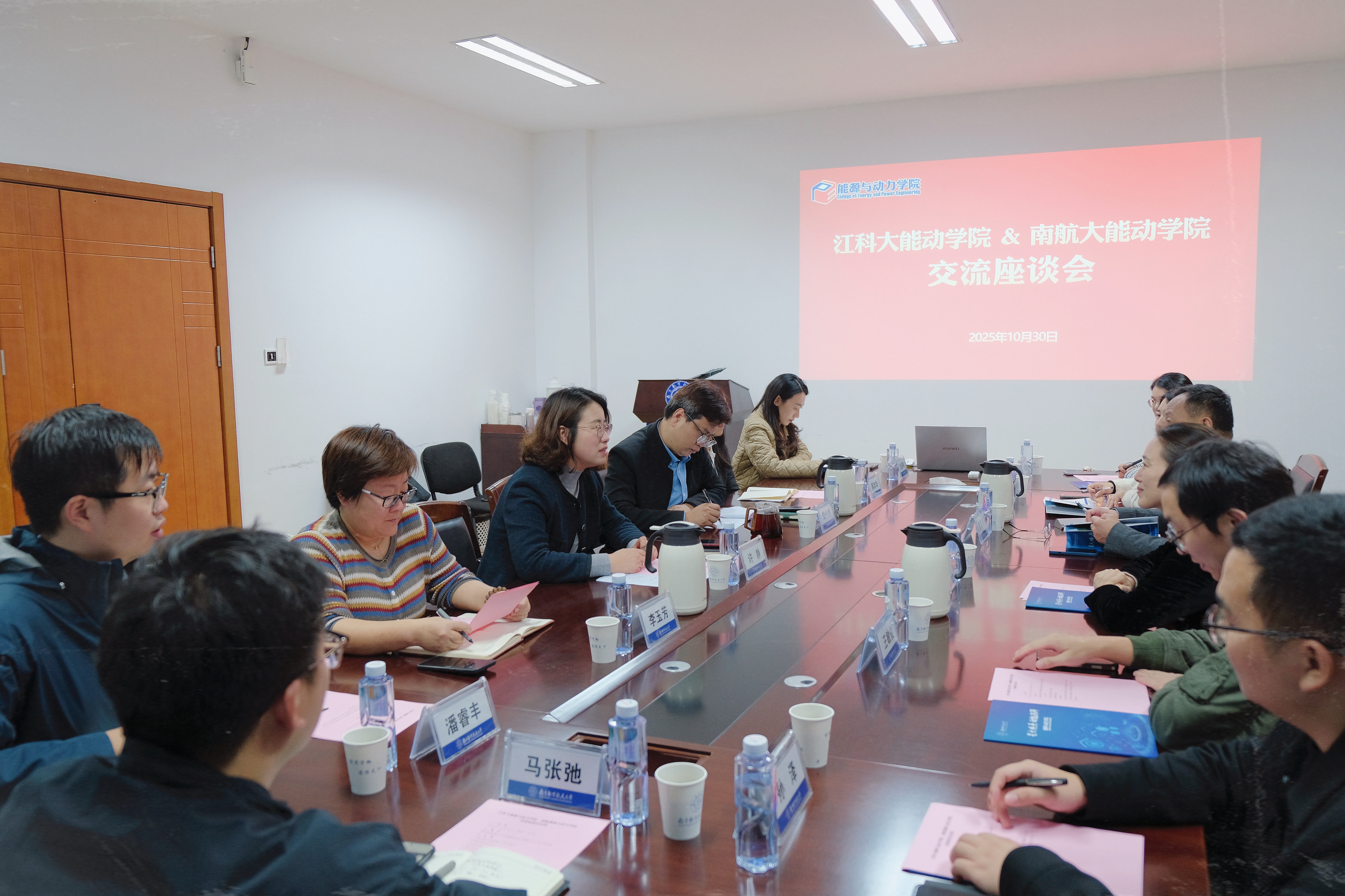 许静对戴楚怡一行的到访表示热烈欢迎,并系统介绍了学院党建工作的思路与实践成效。她表示,希望以此次交流为契机,进一步推动两院在党建与业务工作上的深度融合与协同发展。戴楚怡也分享了江苏科技大学能动学院在党建引领、师生党支部建设等方面的积极探索与成果。