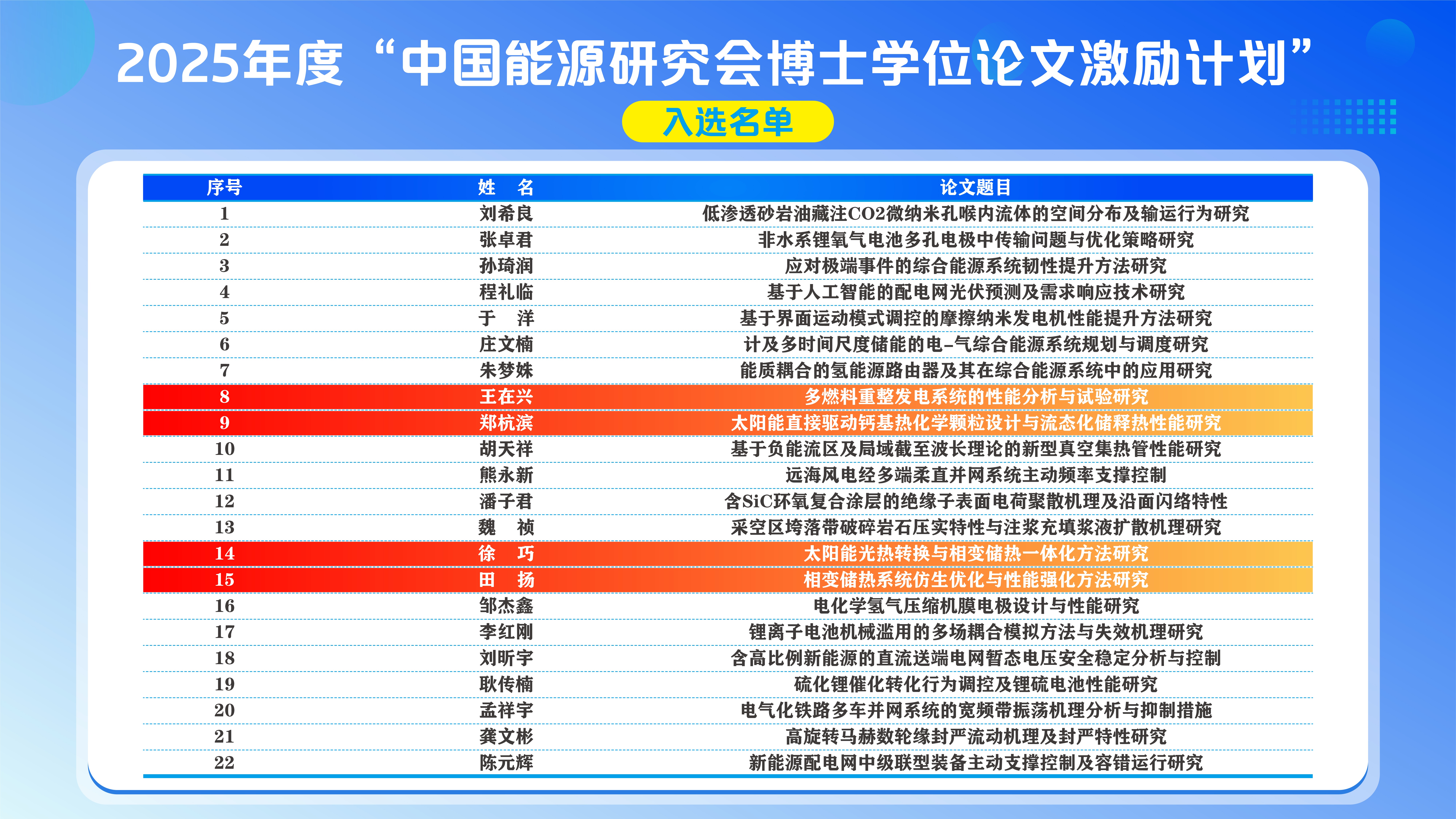 中国能源研究会于1981年1月成立,是由从事能源科学技术的相关企事业单位、社会团体和科技工作者自愿结成的全国性、学术性、非营利性社会组织,全国性4A级社团。“中国能源研究会学位论文激励计划”旨在深入实施创新驱动发展战略,进一步加强能源领域青年科技人才培养,激励青年学者开展创新性研究。入选学位论文将纳入2025年中国能源研究会学术年会青年论坛集中发布。此次评选经形式审查、网络评审、会议讨论等程序,共有22篇博士论文入选激励计划。