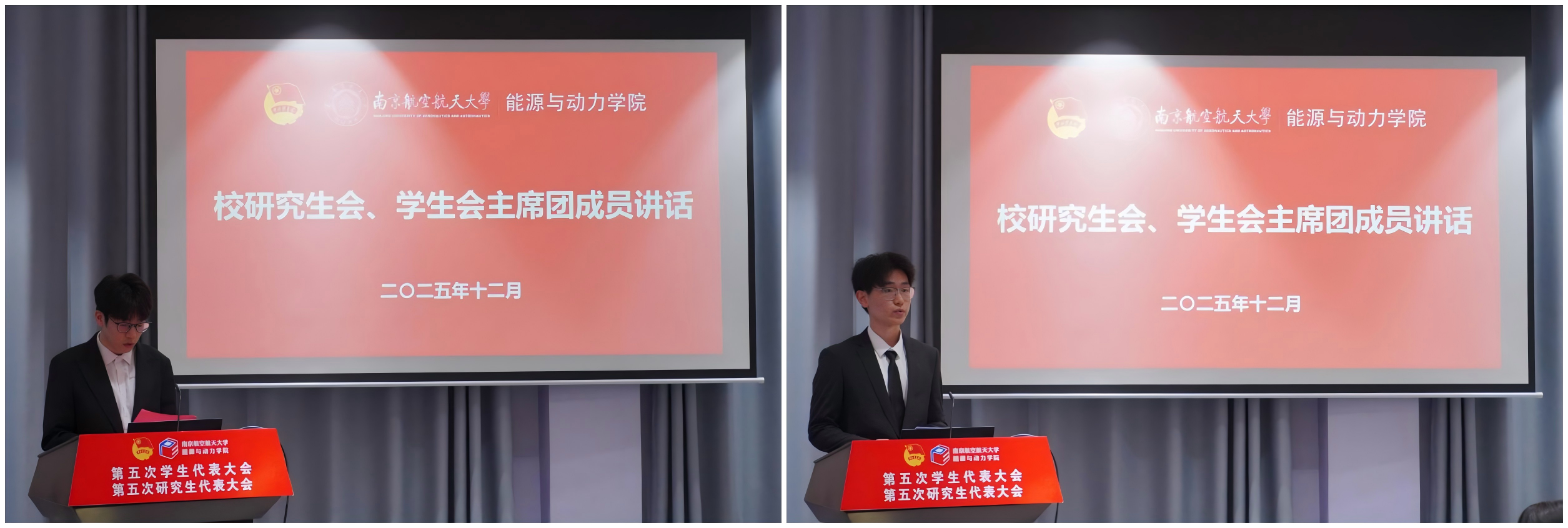 郭储维、鞠弘朝分别代表校学生会、校研究生会向大会致辞,肯定了学院学生会、研究生会的工作成效,希望未来强化领先意识、凝聚精神力量、提升服务能力,和全校学生会组织携手共进,奋力书写挺膺担当的青春篇章。