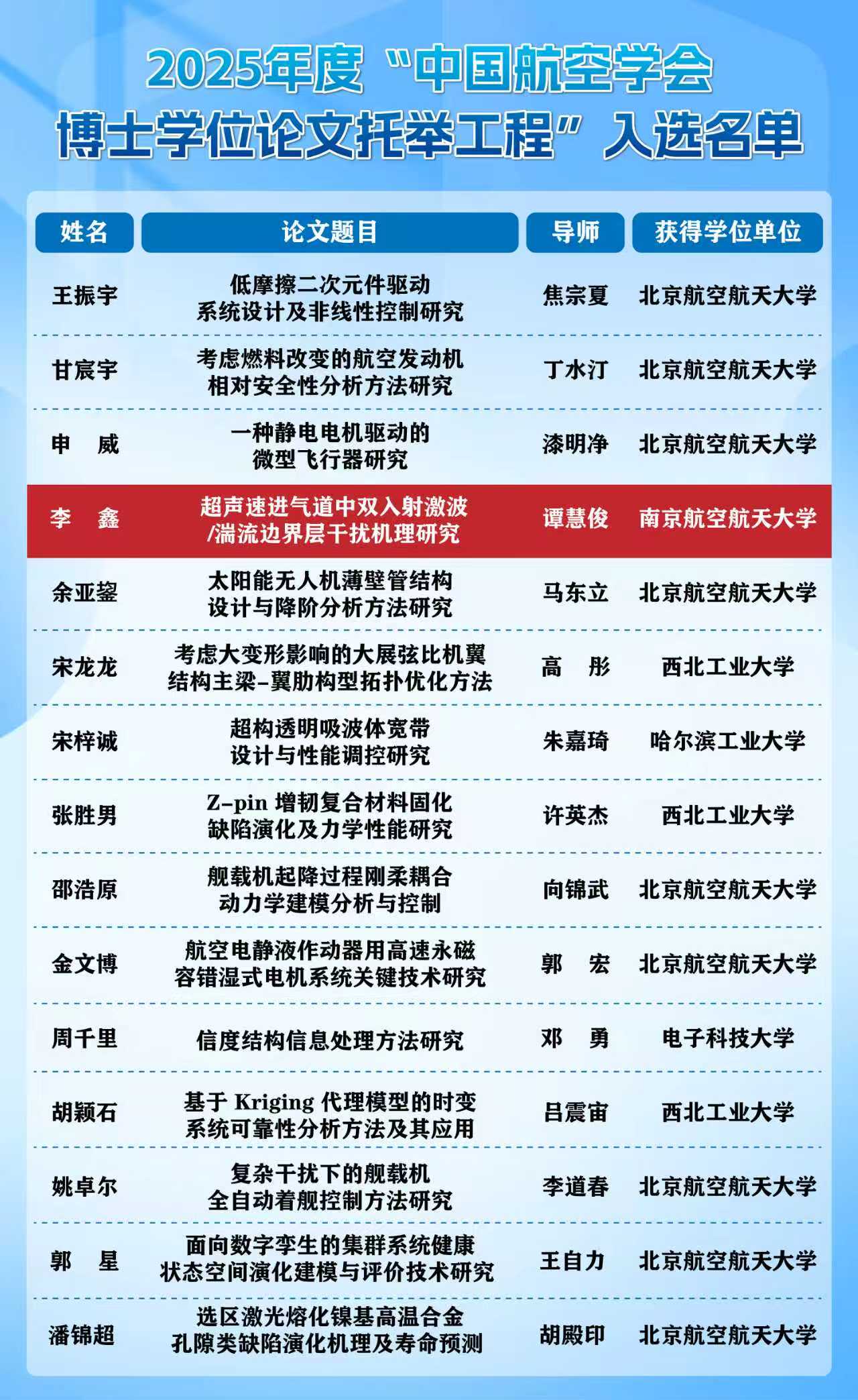 “中国航空学会研究生学位论文托举工程”旨在推动中国航空科技进步,鼓励创新性研究,促进青年人才成长,为下一步实施中国科协青年人才托举工程培养储备人才。此次评选共收到10个单位会员、19个专业分会、15名两院院士提名的99份材料,经过形式审查、专业初评(双盲)、综合评审(双盲),最终15人入围中国航空学会博士学位论文托举工程。李鑫博士是本届中国航空学会博士学位论文托举工程的南航唯一入选者,其余获奖人培养单位均为985高校。