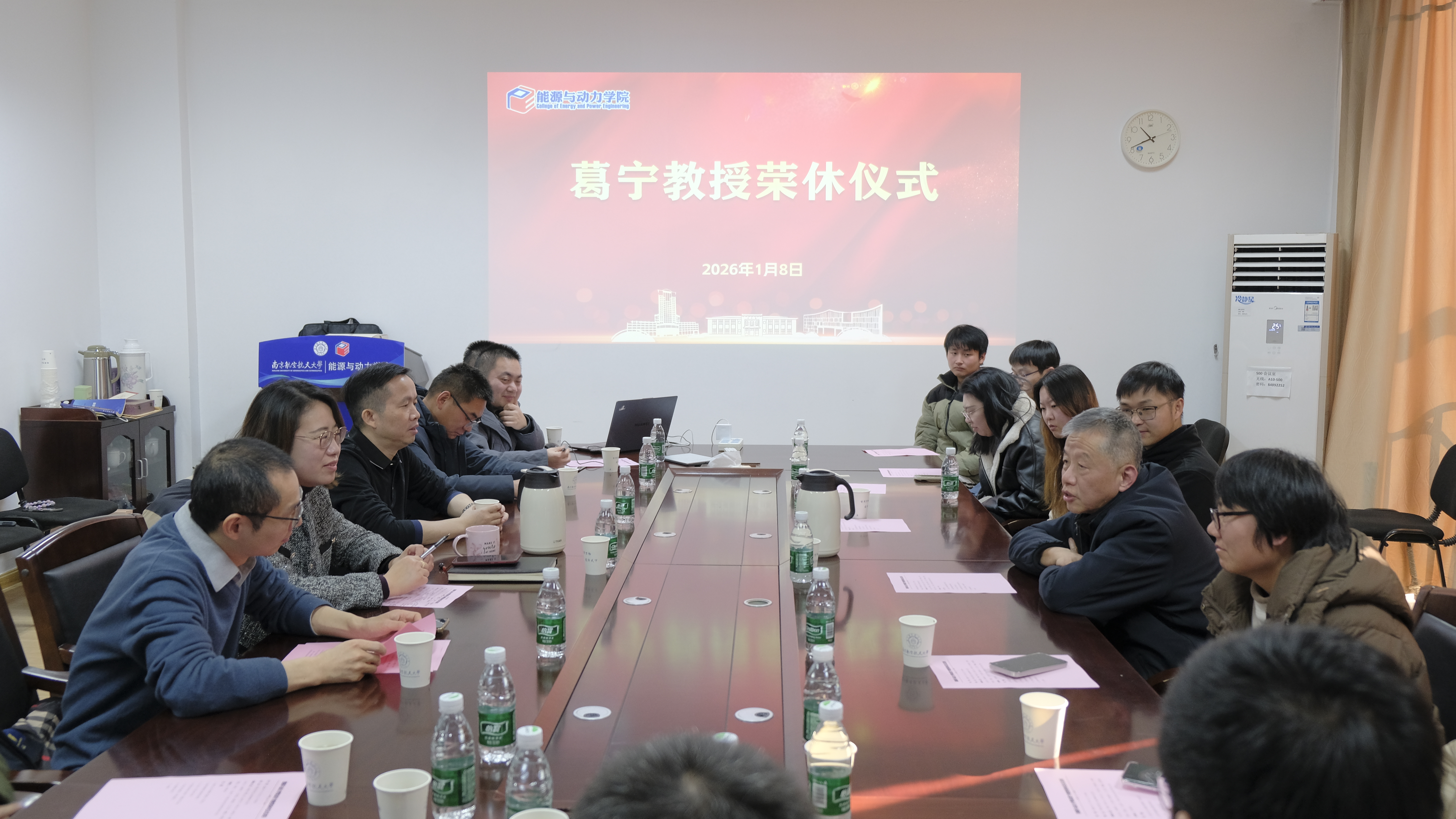1月8日上午,英国正版365首页在明故宫校区为葛宁教授举办荣休仪式。学院党委书记许静、院长谭慧俊、党委副书记樊小杰,内流与叶轮机械系教师代表、党政办公室相关负责人及学生代表欢聚一堂。仪式由内流与叶轮机械系党支部书记黄河峡主持。